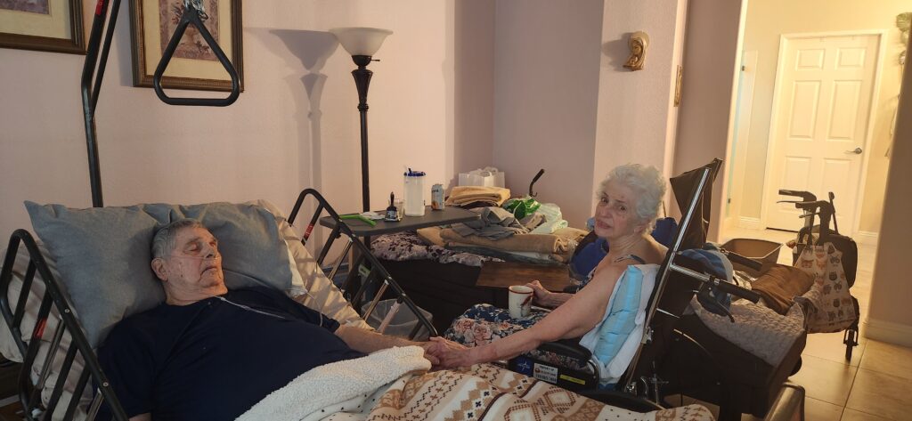 I caught the flight from Charleston to Palm Springs, stopping in Denver. The flights were uneventful. My sister Lisa picked me up from the airport and I was at the house by around 10:15. My sister Deborah and my mother were the only ones in the house. My stepfather, whose name is Charles Moyer and I call Mr. M, was sleeping. Deborah was supposed to wake him at 11 pm for his pain medicine. I went in quietly and sat with him for a minute and then waited patiently until it was time to wake him. I said hello to my mom.